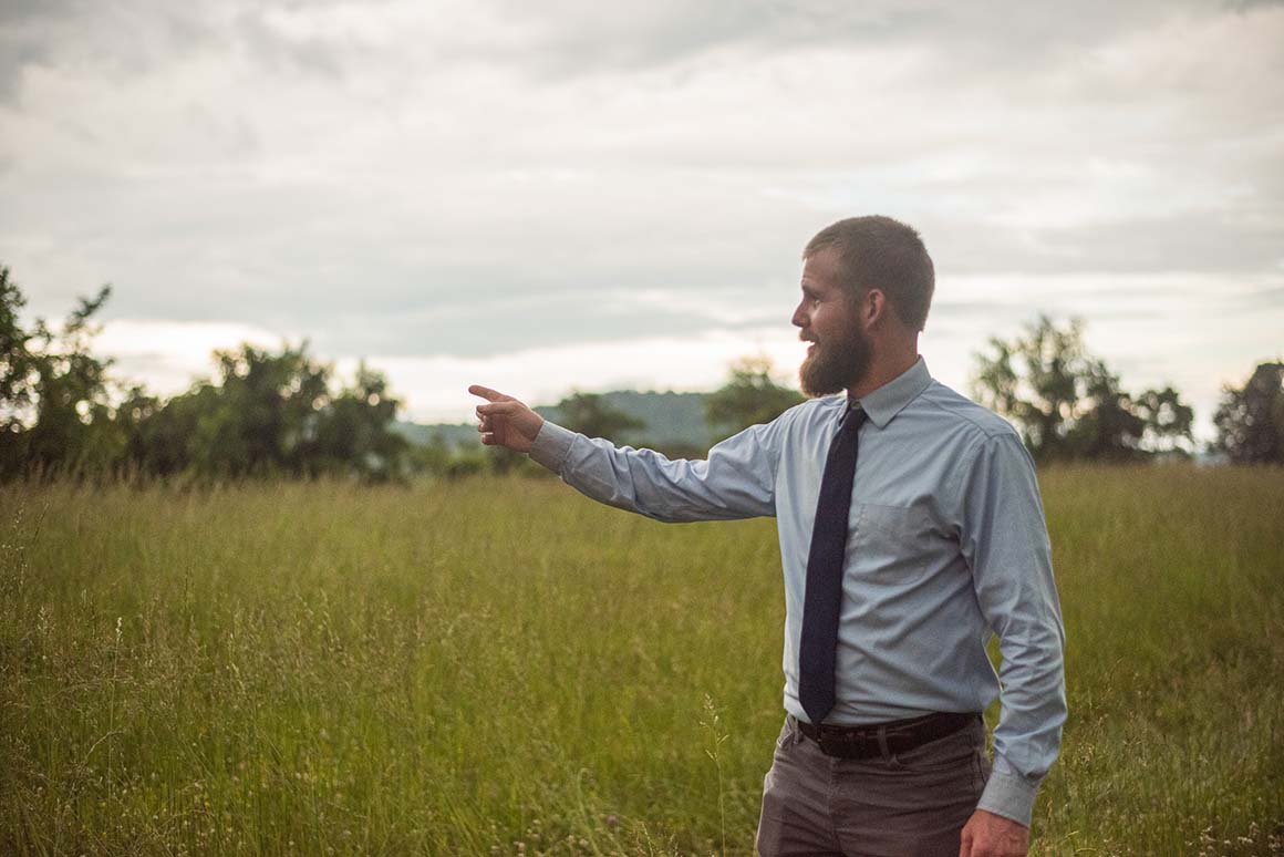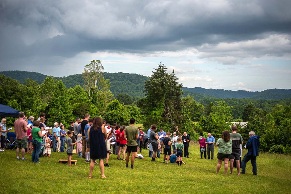 A memorial of this sort is not dead, not a simple historical marker, but a place of remembering eternal Beauty, to which the whole garden of the landscape bows, as it were, in the presence of the God who walks with man in the cool of the day. Using the language of John Senior, the Catholic educational reformer, Fickley aims to instill a “poetic imagination” in his students, shaping them holistically, in both mind and body, training their senses to recognize and revere the True, the Good, and the Beautiful. He says, “At St. Dunstan’s, students will be invited to experience the created order with their senses and imaginations fully engaged. By beginning their journey towards wisdom in the poetic mode – soaking in the beauty, truth, and goodness of the stars, harrowing adventures, fortifying songs, and enthralling stories – students will be invited into a life of joy.” After arriving in the open fields where St. Dunstan’s Academy will soon be established, we trekked through the grass in a brief downpour, to higher ground where we might survey the 176 acre property. We strolled past the few standing structures, Wordsworth-like, beneath the abbey-ruins of society at large, to be reminded of something more deeply and eternally Good. We ascended the hill where we would have a picnic and sing our Evensong canticles with the members of All Saints Anglican (Charlottesville) and friends of St. Dunstan’s from near and far. The school has attracted supporters from all over the North American Anglican world. Laypersons and clergy representing a variety of dioceses and denominations were in attendance (ACNA, REC, APA, ACC, etc.). Ken Myers of Mars Hill Audio fame directed a small choir to lead us in singing a capella, “For the beauty of the earth, / for the glory of the skies, / for the love which from our birth / over and around us lies: / Lord of all, to Thee we raise / this our hymn of grateful praise.” They had just closed the deal to purchase the property the day prior, on St. Dunstan’s Day. The timing was the Lord’s. That evening, the first lesson was from Job: “Whence then cometh wisdom? and where is the place of understanding? … God understandeth the way thereof. For he looketh to the ends of the earth, and seeth under the whole heaven.” Native Virginians call this land “God’s country”. As we raised our voices together on the high hill, surrounded by mountain peaks in all directions, looking out to the end of the property and beyond, we remembered why.